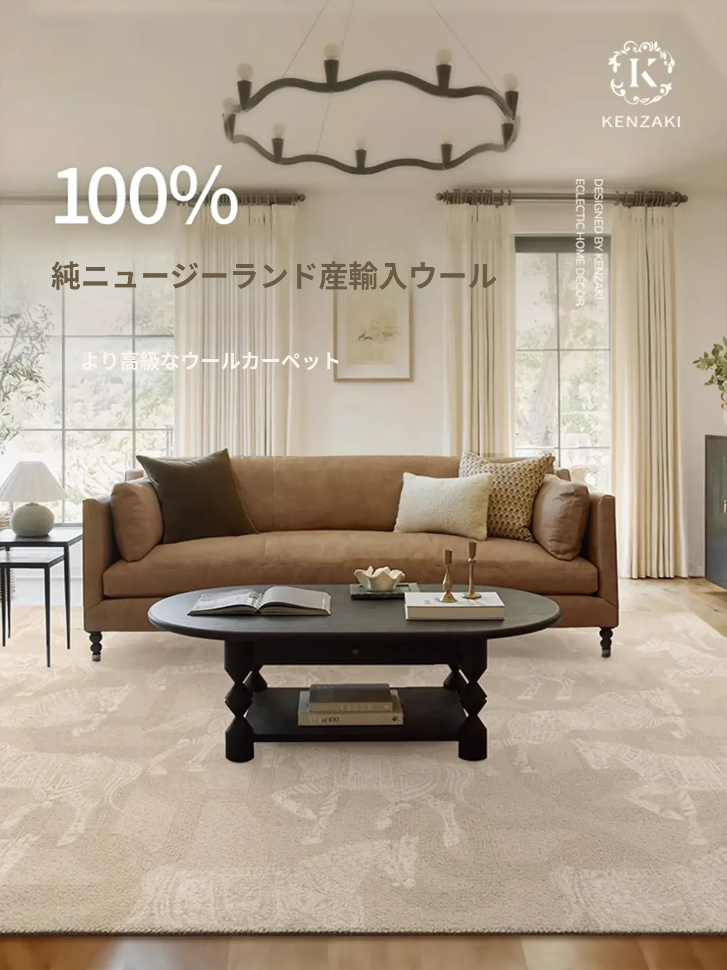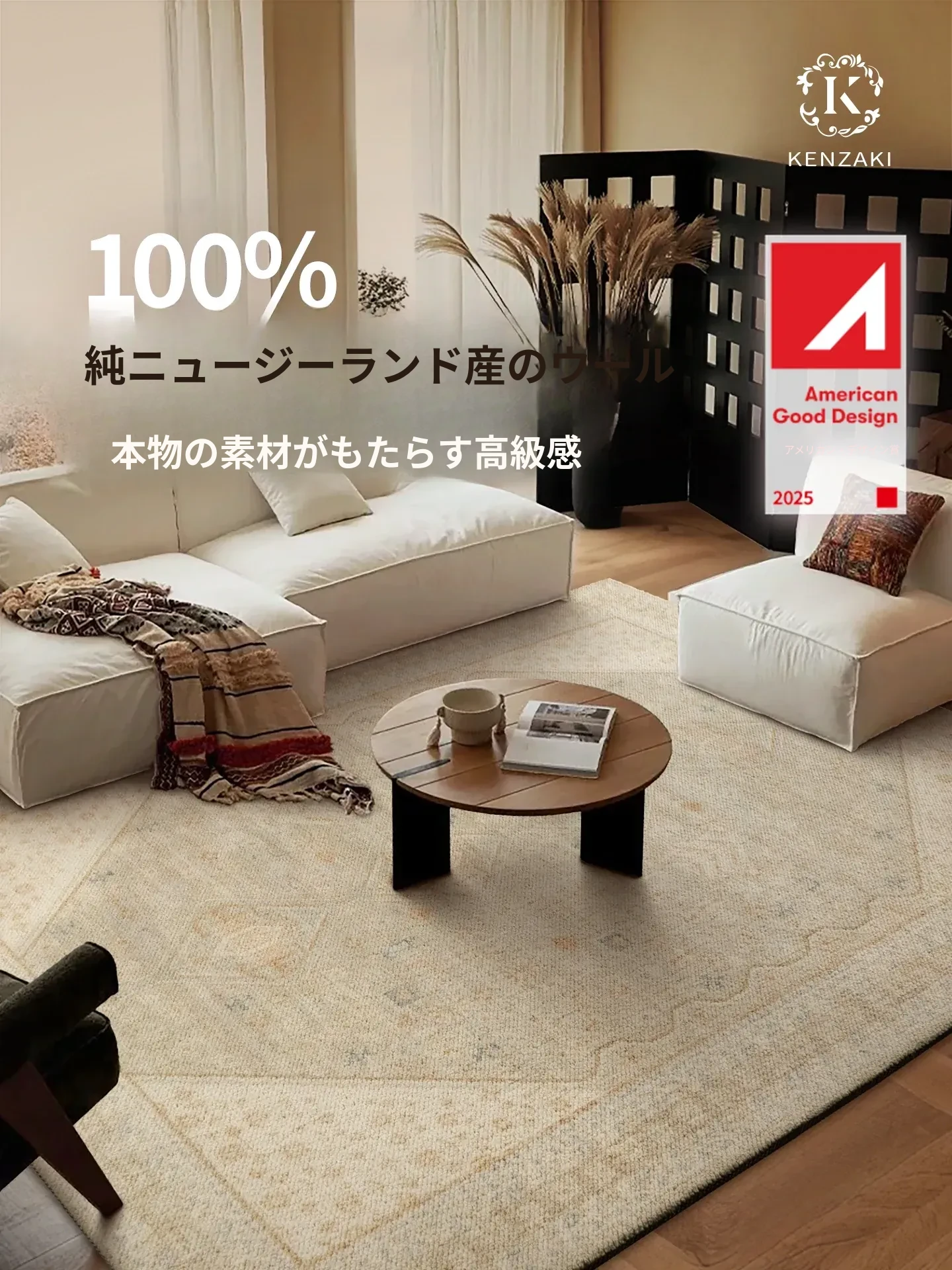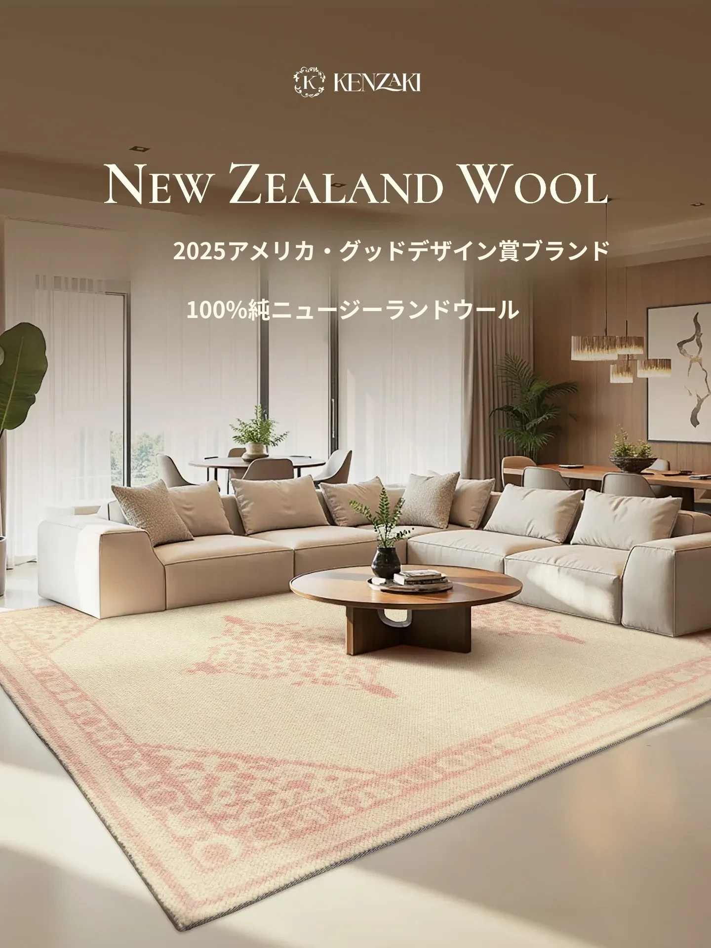 100%ニュージーランドウール使用!ラグジュアリー感あふれるフレンチクリーム風の円形カーペット。リビングやベッドサイドに最適なシンプルデザインで、上質な安らぎをお届けします。