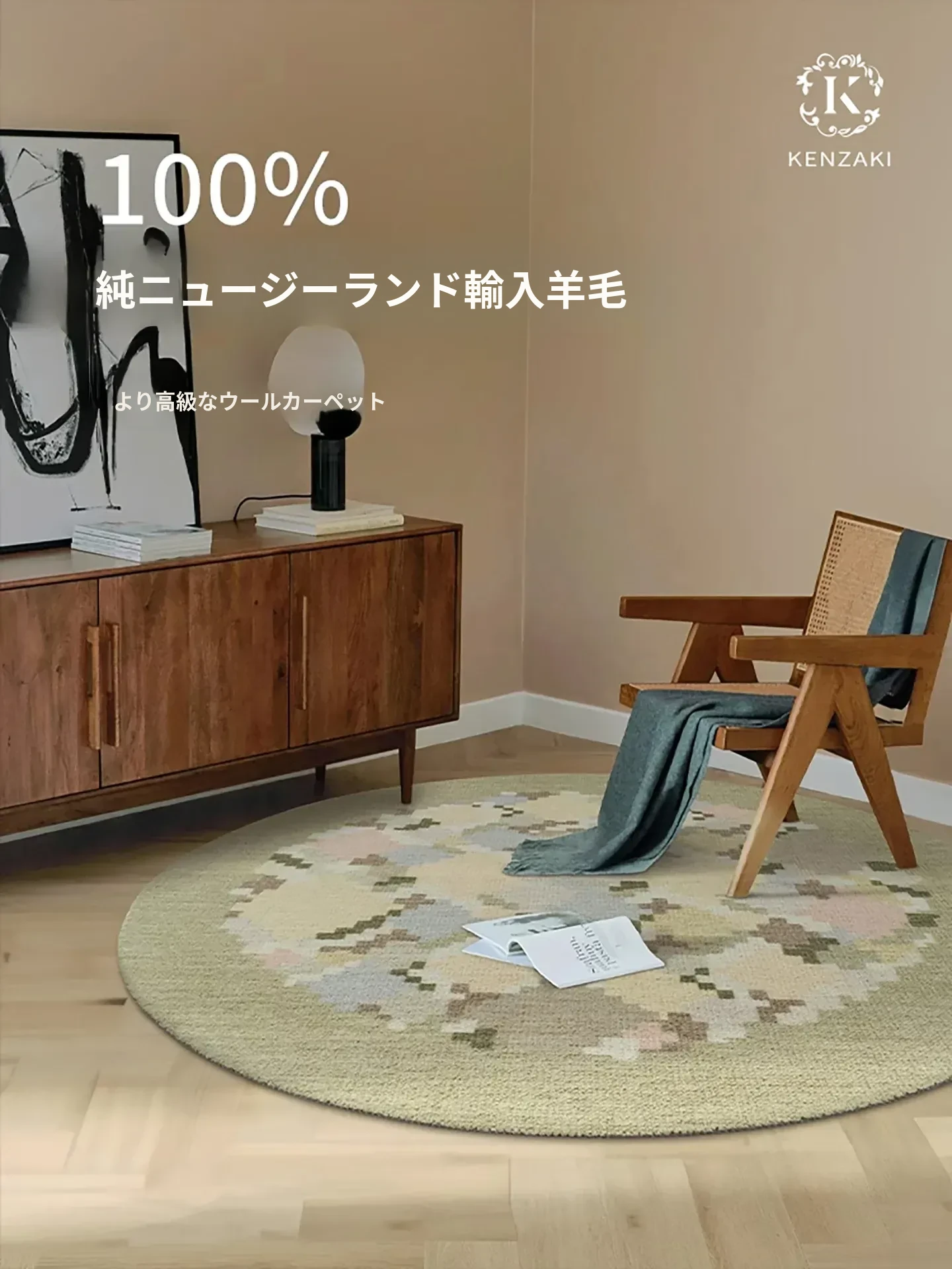 100%ニュージーランドウール使用!ラグジュアリーなラウンドカーペット、リビングやベッドサイドに最適なヴィンテージグリーンのデザイン。高級感溢れるインテリアを演出し、心地よい空間を提供します。