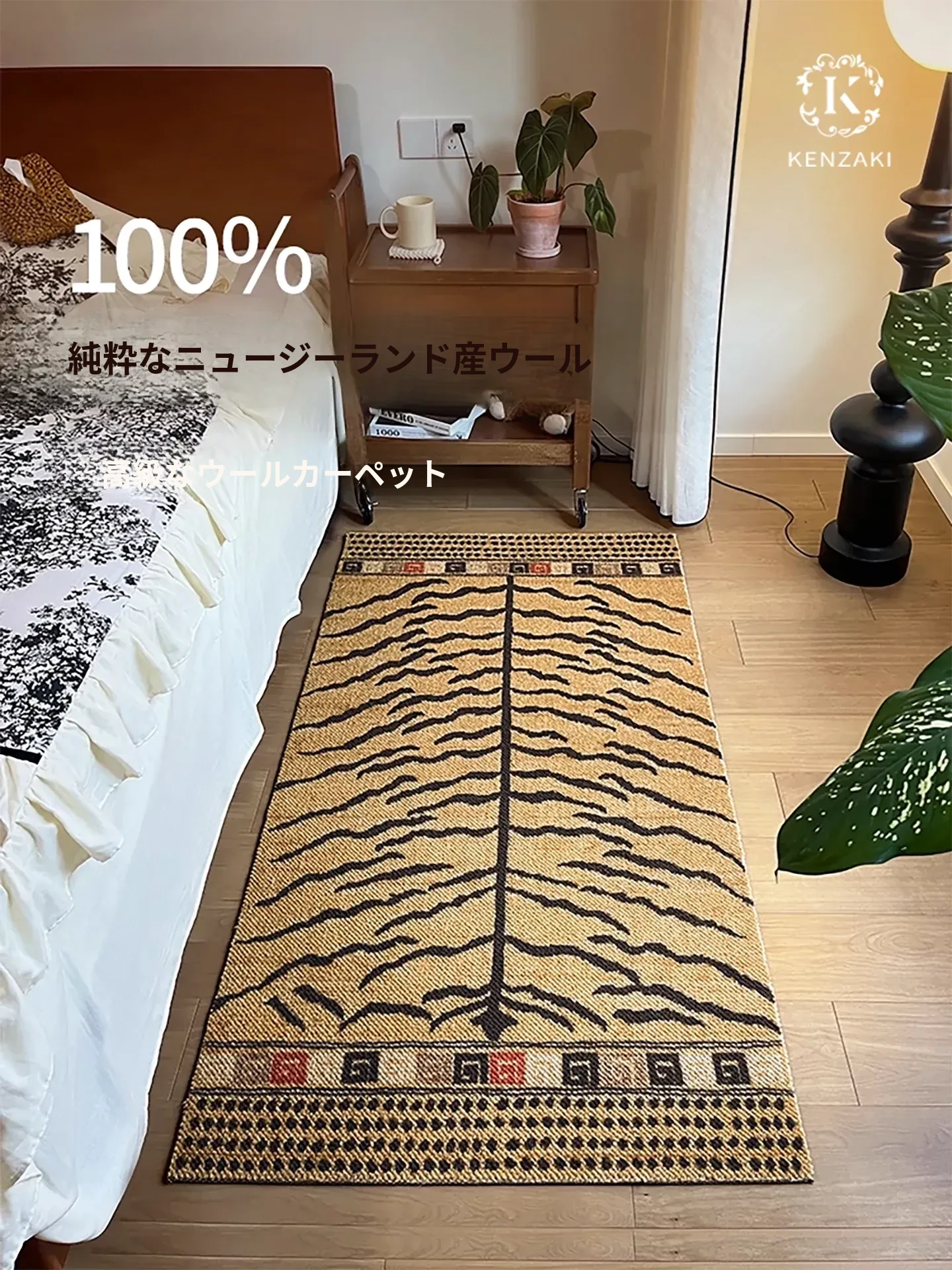 100%純粋なニュージーランドウールラグ - リビング・寝室にぴったりの高級感あふれるヴィンテージ風フレンチ&アメリカンスタイル、虎柄デザインでお部屋を華やかに演出!
