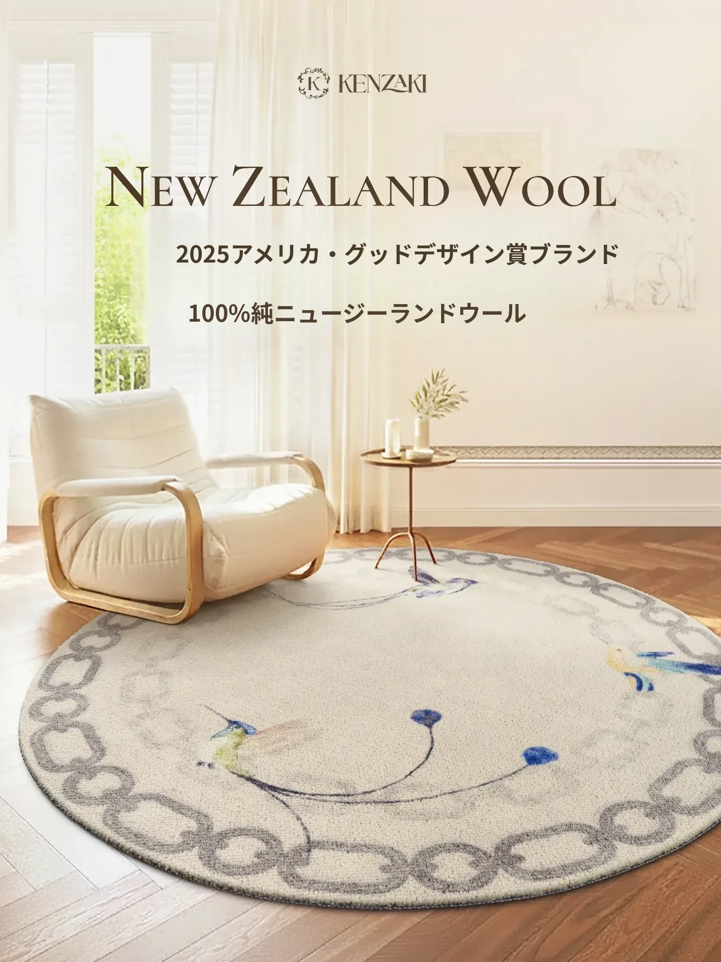100%ニュージーランド産ウールラグ|贅沢感あふれるフレンチビンテージデザイン|リビングや寝室にぴったりなラウンドシェイプ|洗練された飛び鳥モチーフでお部屋を華やかに演出!