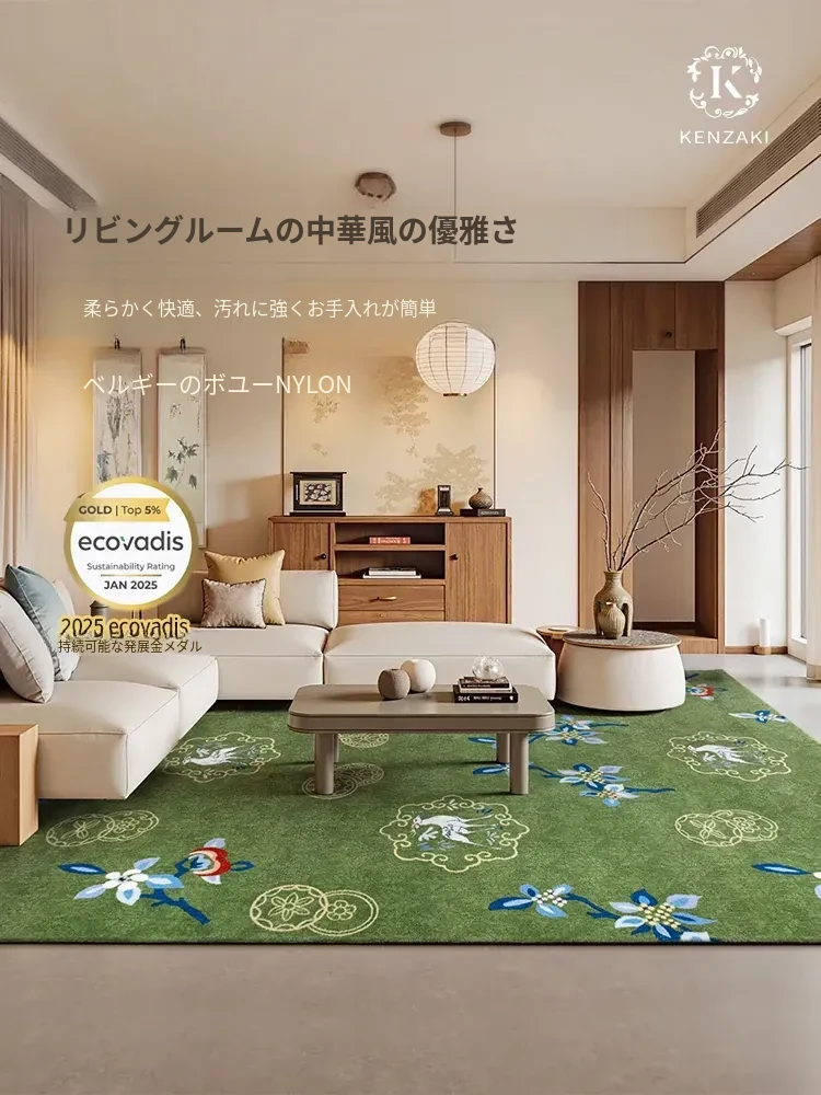 新中式リビング用カーペット - ソファやテーブルにぴったり!高級感あふれるグリーンのデザイン、厚手で洗わずに拭ける便利さ。寝室のベッドサイドにも最適な一枚。おしゃれで快適な空間を演出します!