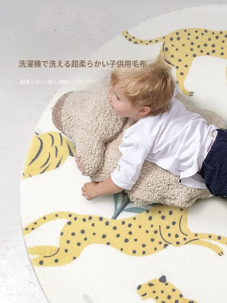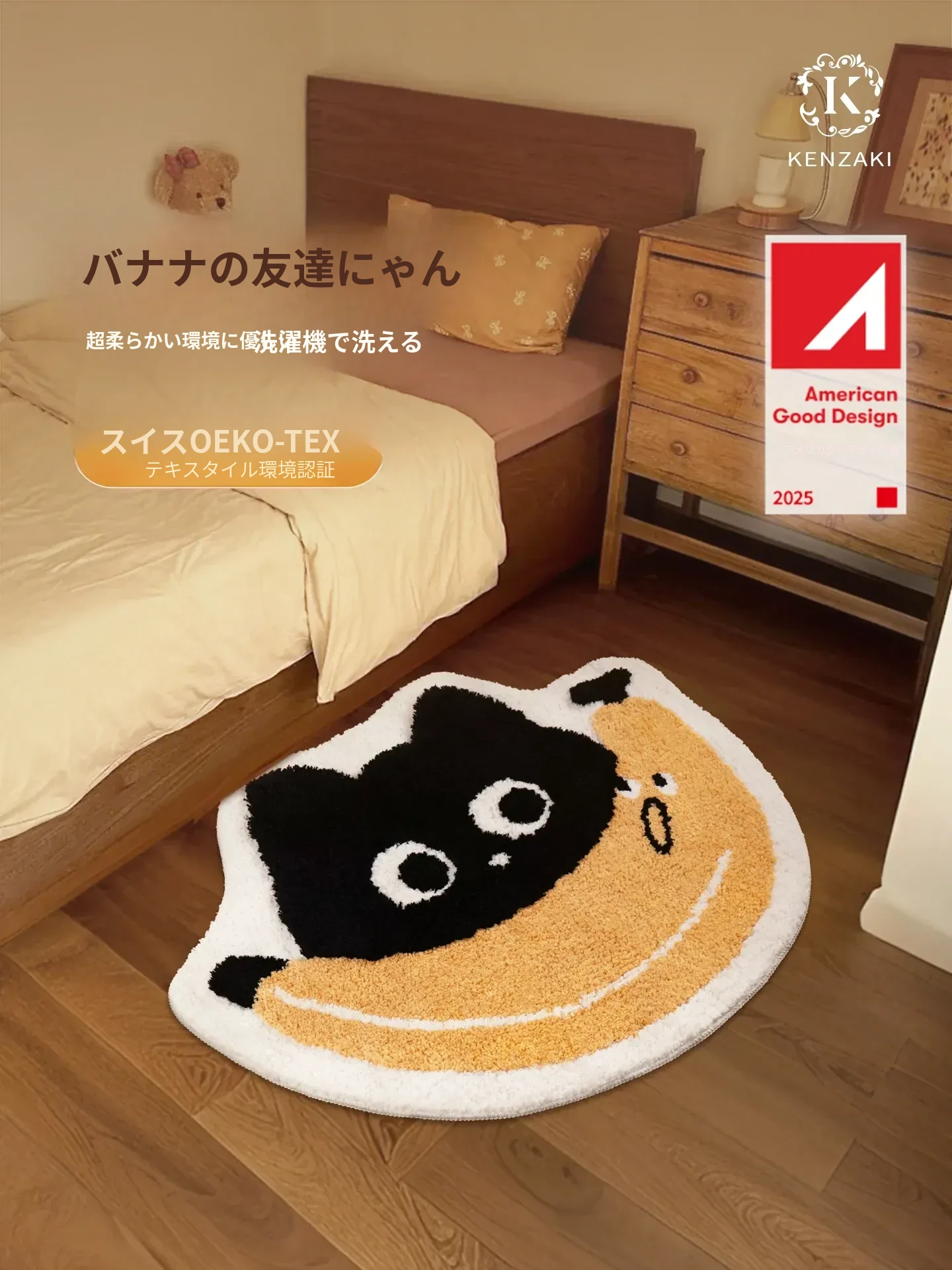 子供部屋にぴったり!おしゃれなインスタ風のベッドサイドカーペット。男の子も女の子も大好きな可愛いバナナや猫のデザイン。洗濯機で簡単に洗えるから、いつでも清潔!
