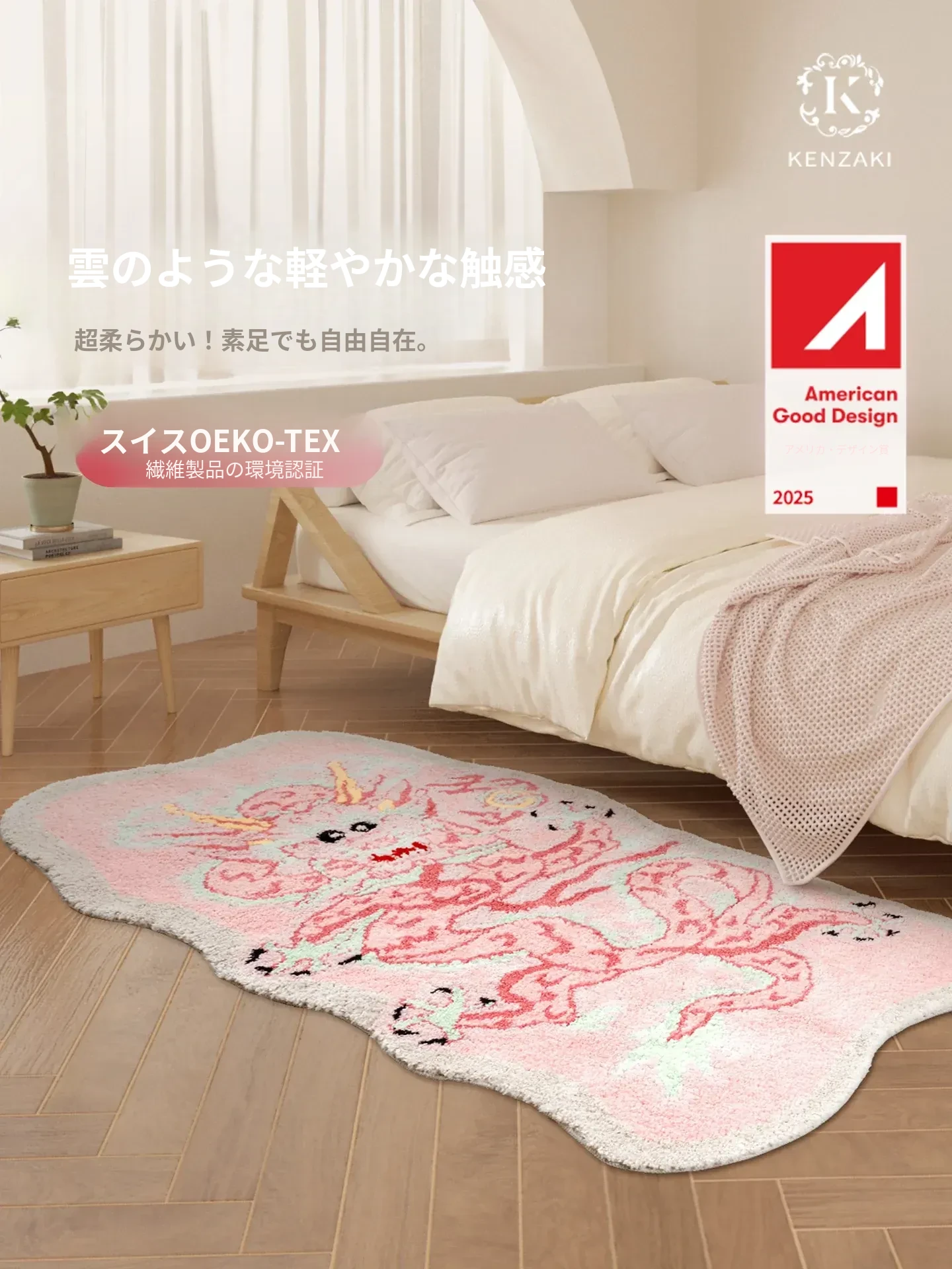 女の子のためのピンクのドラゴンデザイン!厚手で洗える子供用カーペット - 寝室やリビング、デスクの下に最適!新中式スタイルで、お部屋を可愛く彩ります。