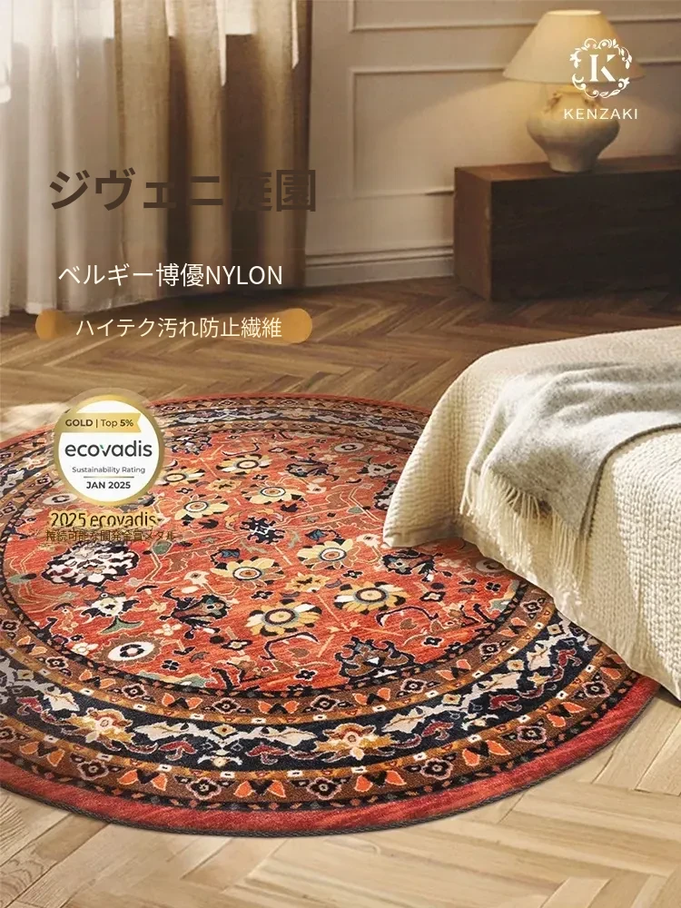 100%純ニュージーランドウールラグ・フレンチビンテージデザイン・ラウンド型・上質なレッド・リビング・ベッドサイドマット・高級感あふれる厚手の一品!