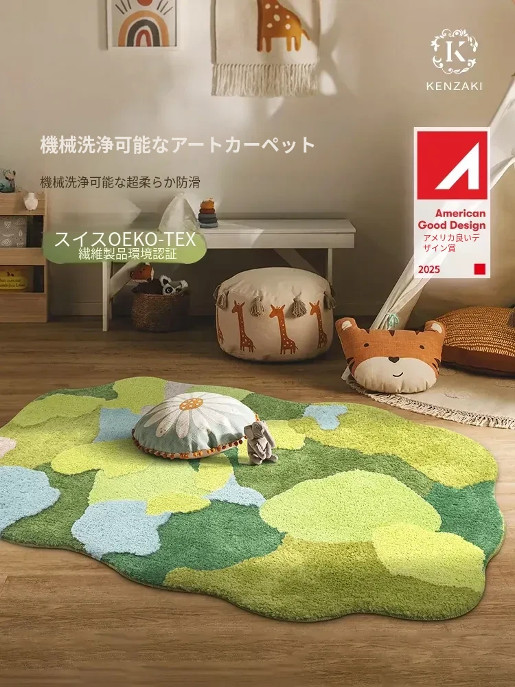 子供部屋にぴったり!厚手の緑色モスデザインのベビーカーペット。転倒防止機能付きで、安心して遊べます。個性的な形状で、お部屋を可愛く演出。洗濯機で簡単お手入れ!