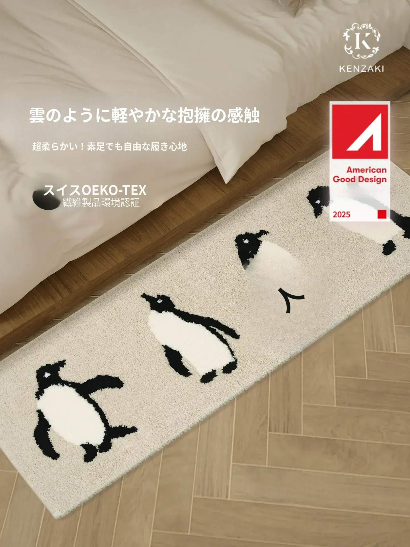 かわいいペンギンデザインの子供用カーペット!インテリアにぴったりのベージュ色で、男の子も女の子も大喜び!滑り止め加工で安全、洗濯機で洗えるからお手入れも簡単。子供部屋やベッドサイドに最適なアイテムです!