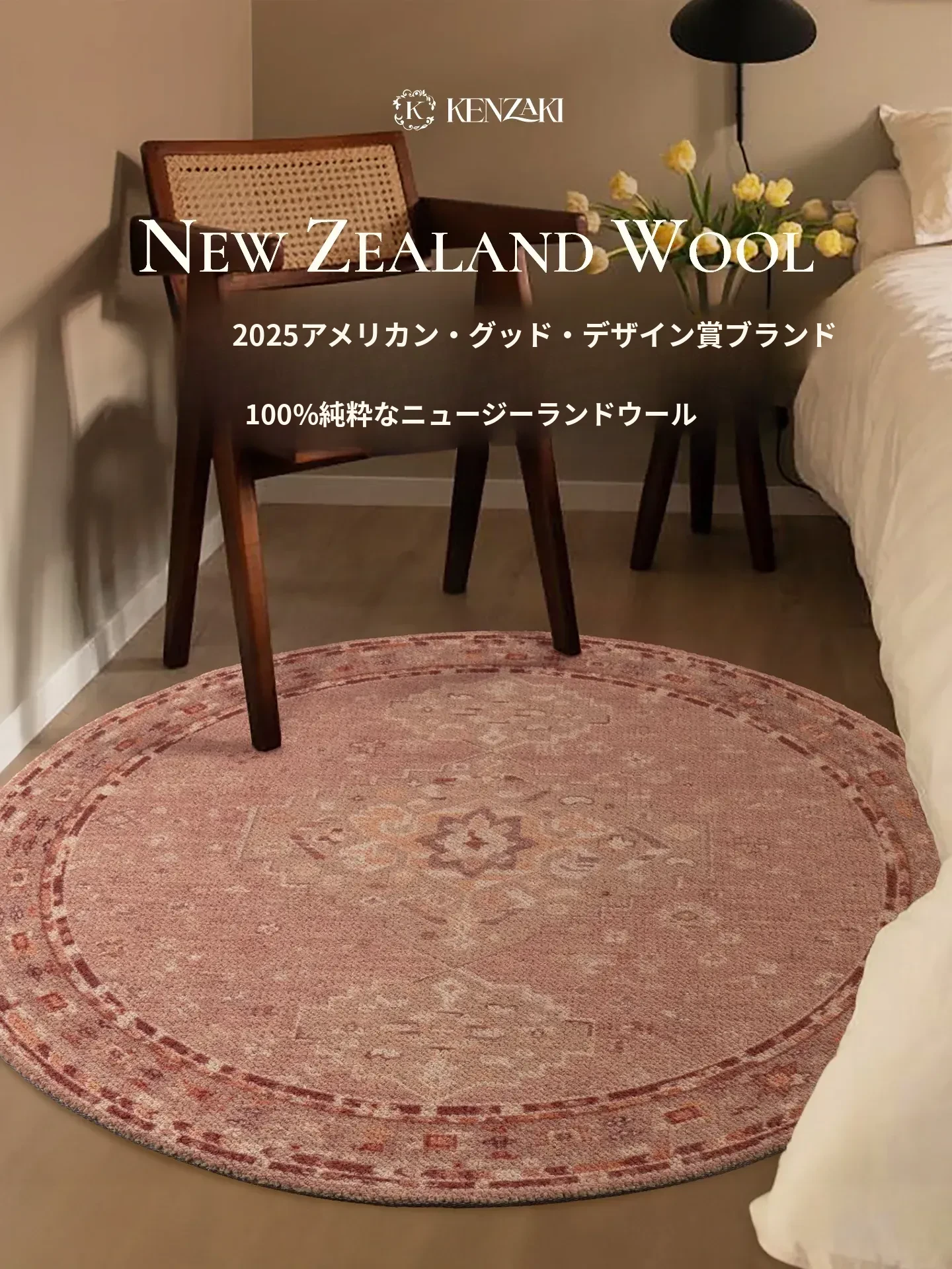 100%ニュージーランド製ウールラグ|ヴィンテージデザインのラウンドカーペット|シングルルームやリビングに最適|フレンチシックな軽奢スタイルでお部屋を華やかに演出!