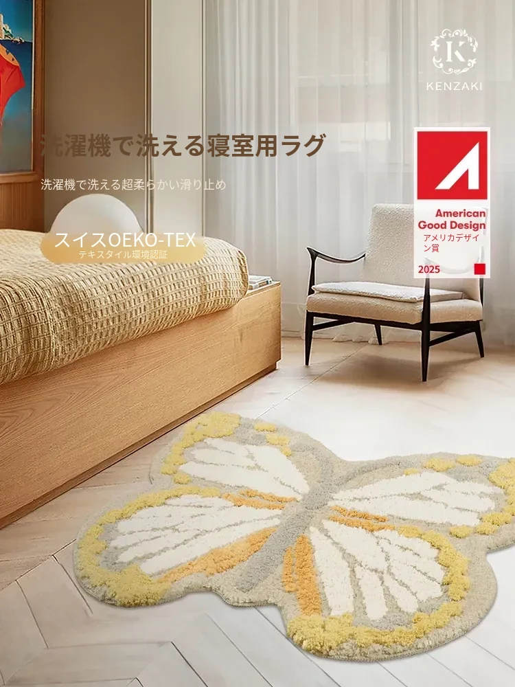 可愛い黄色のバタフライデザイン!男の子・女の子にぴったりなインスタ風カーペット。ベッドサイドやリビングに最適!洗濯機で簡単お手入れできる異形マットで、快適な空間を演出します。