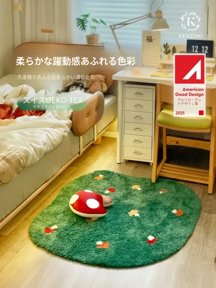 子供部屋にぴったり!かわいいキノコの森デザインの多様な形状のカーペット。心を癒すグリーンカラーで、リビングやベッドサイドにも最適。洗濯機で洗えるのでお手入れも簡単!