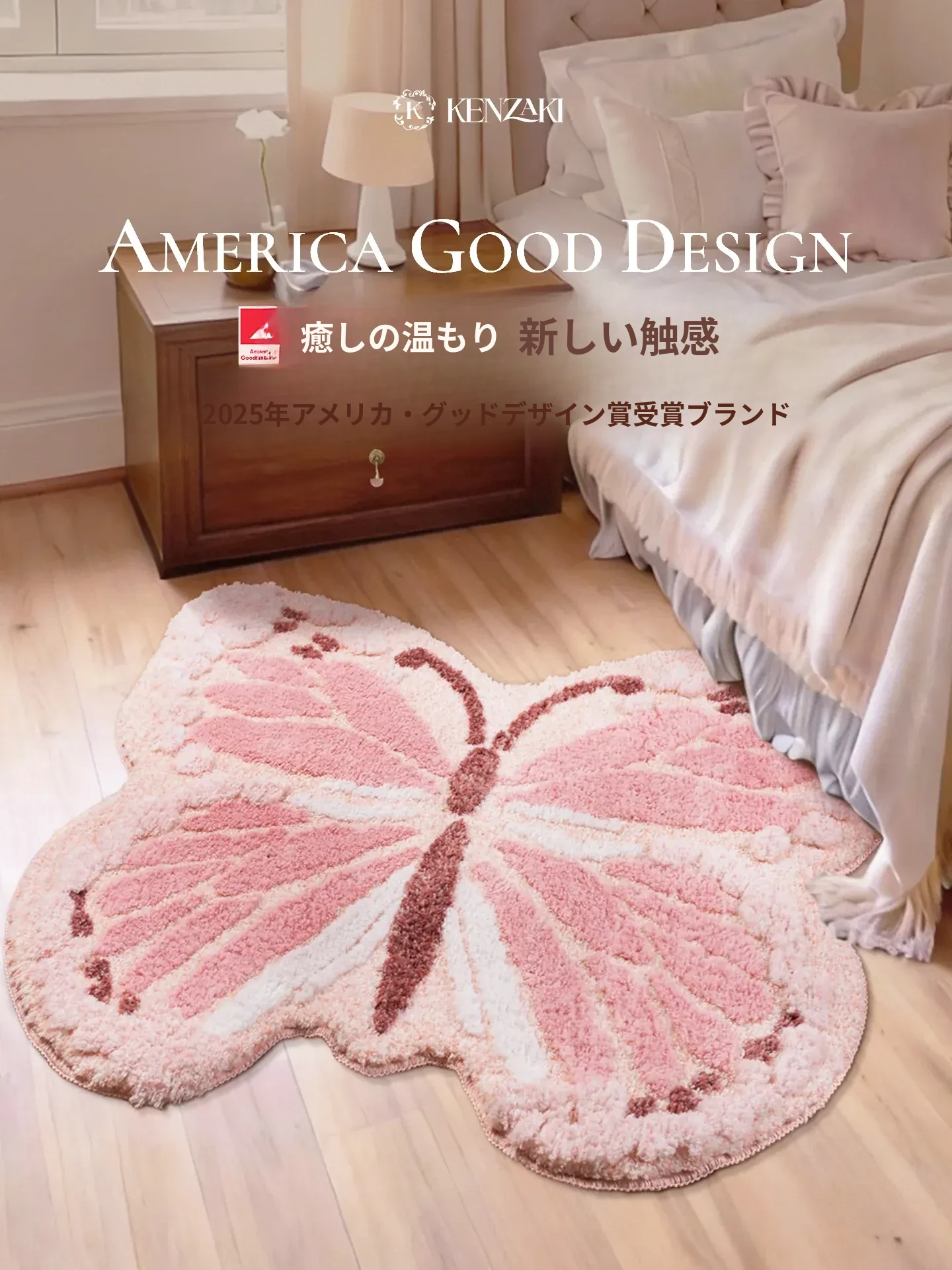 可愛らしいピンクの蝶々デザイン!おしゃれな子供部屋にぴったりなカーペット。軽量・滑り止め加工で安心、さらに洗濯機で洗えるからお手入れも簡単!お子様のベッドサイドに華やかさをプラス。